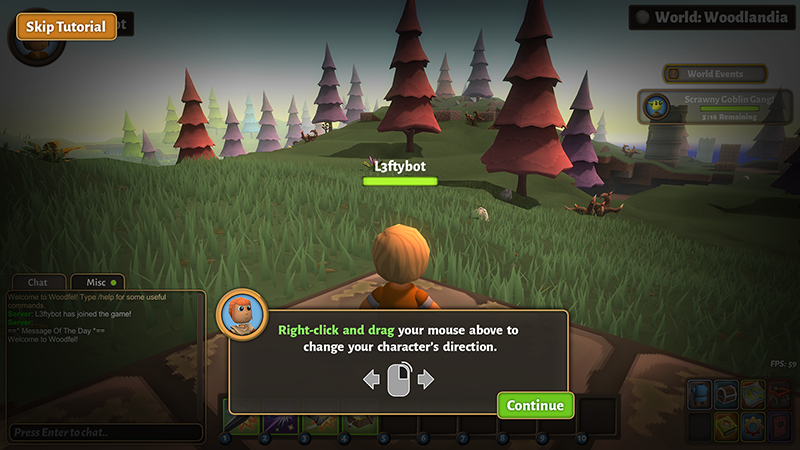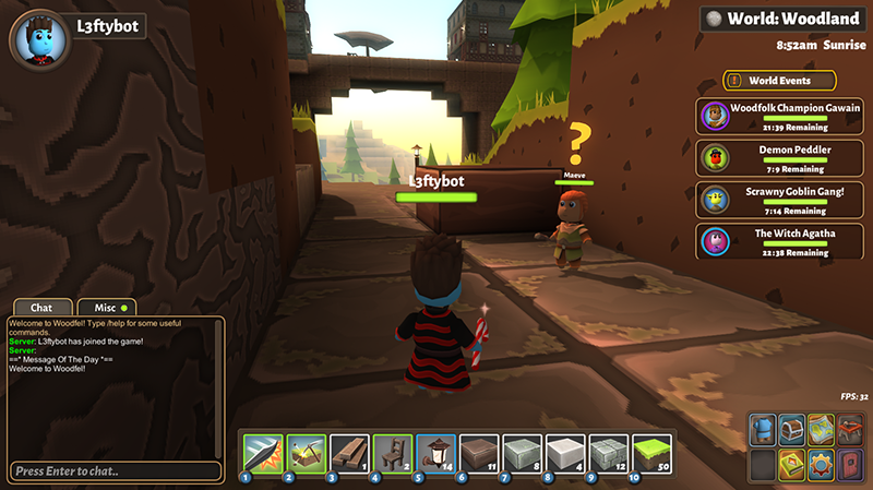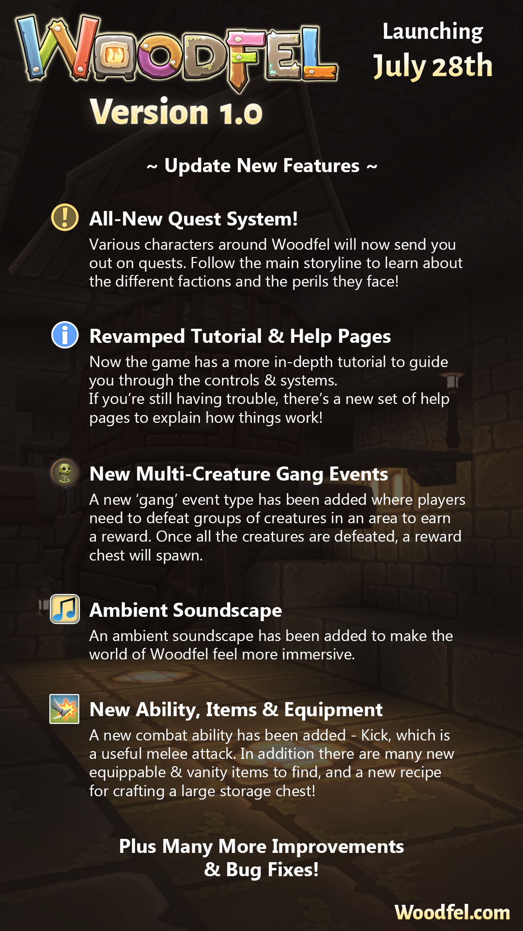 The major changes in Woodfel 1.0 will be an improved tutorial, the addition of a quest system (with a bit of a storyline!), and a new type of world